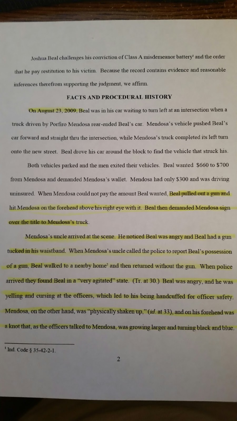 Joshua Beal was parked in front of a fire house where you cannot be blocking the driveway, he got out of the vehicle in typical ignorant fashion to argue a point that was not non-negotiable, which is very typical for people like him. Joshua refused to educate himself as to the limitations of his concealed carry permit from Indiana (which is not transferrable to the State of Illinois) pulled his handgun out and pointed it at the victim, to settle a verbal dispute, because ignorant people like Joshua do NOT know how to talk to people. As a result, a police officer did his duty and stopped a threat from hurting or killing an innocent person.
